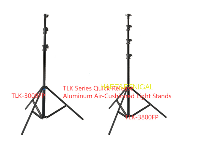 The TLK Series comprises professional-grade quick-release aluminum light stands designed for photographers, videographers, and studio technicians. These stands feature a rapid-deployment mechanism that allows the legs to automatically extend when placed on the ground and retract when lifted, significantly reducing setup and breakdown time. The series includes both standard quick-release models and air-cushioned (FP) variants for smoother height adjustment and added durability.